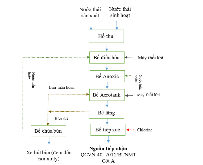 Nước thải sau khi rời khỏi bể tiếp xúc một phần được đưa thẳng ra nguồn tiếp nhận đạt QCVN 40: 20011/BTNMT cột A và xả ra cống thoát nước chung.